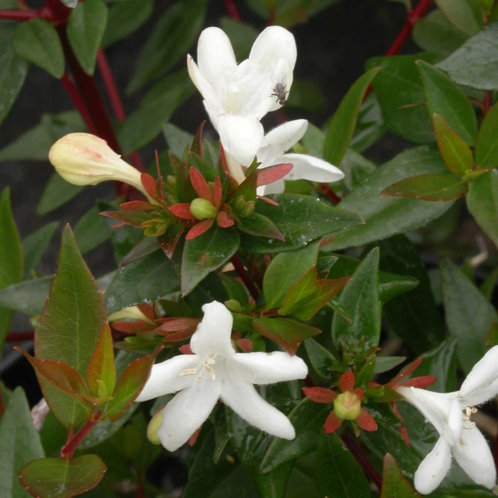 l’abelia grandiflora sherwood est une variété au feuillage vert et aux nouvelles pousses rouges, les fleurs sont rose lilas à partir de juin jusqu’en octobre, ce qui en fait un arbuste à longue floraison.