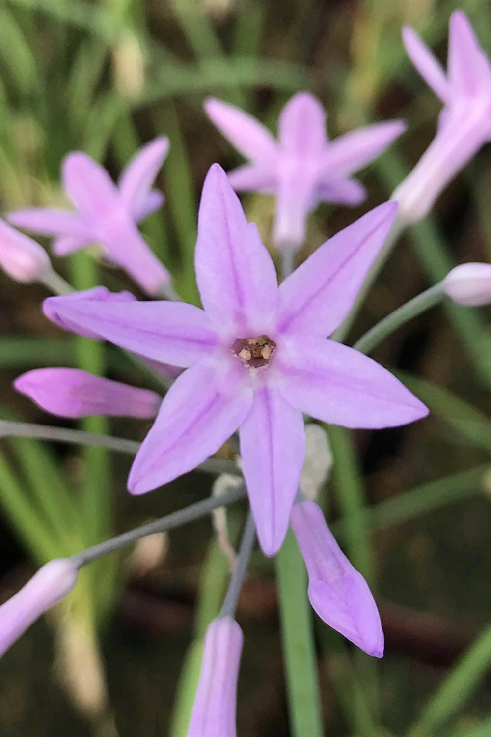c’est une belle vivace bulbeuse, au feuillage gris vert, panaché de blanc. Il dégage une odeur d’ail lorsqu’on le froisse. Ses fleurs en fausses ombelles sont portées par une grande tige florale qui peut atteindre 60 cm. Elles sont tubulées et s’ouvrent en étoiles à 6 pétales rose mauve.